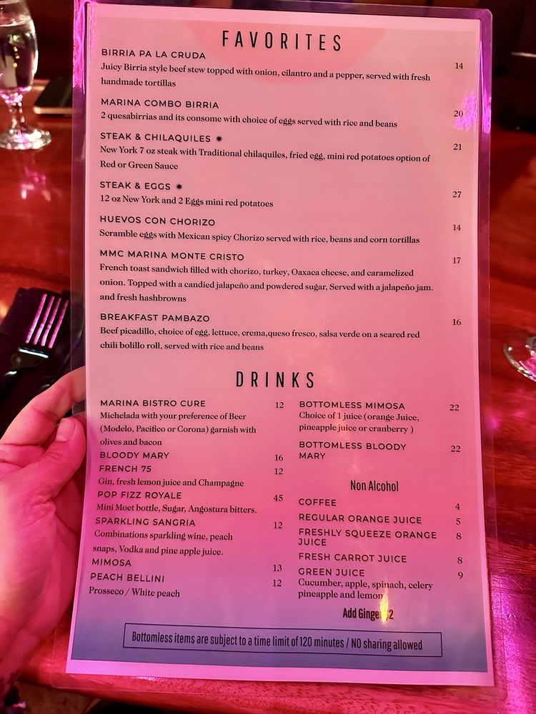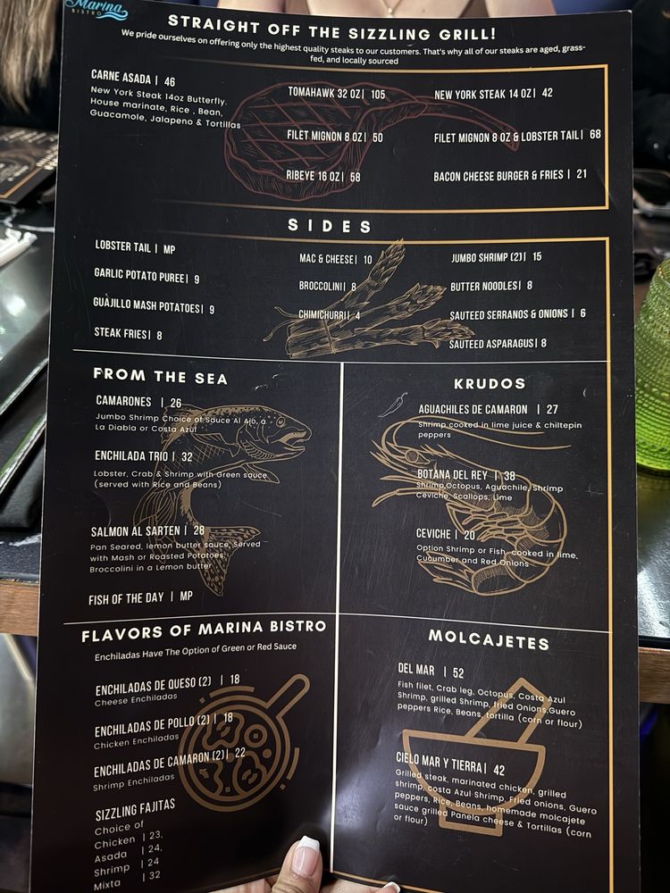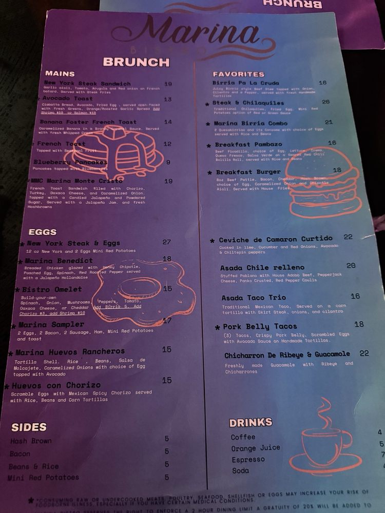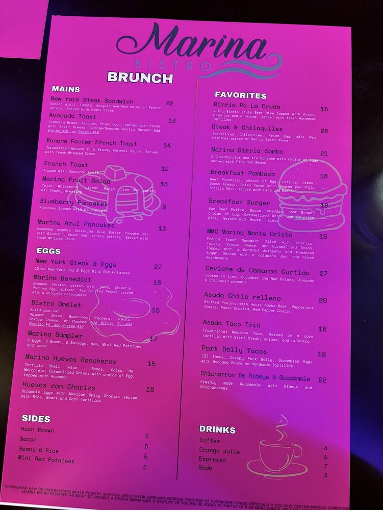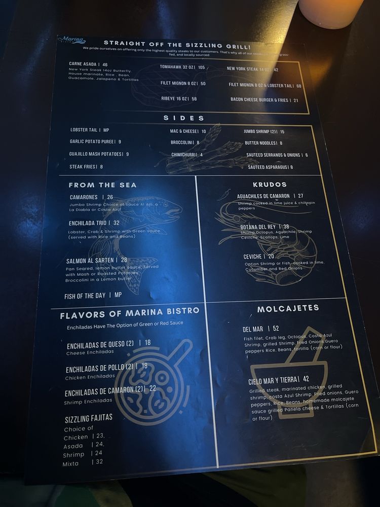 Marina Bistro's menu boasts an enticing selection that caters to all tastes. Highlights include the Carne Asada with rice and guacamole for a hearty meal, and the fresh, zesty Aguachiles Rojos featuring shrimp soaked in lime. The Pork Belly Tacos are a favorite, offering a crispy delight wrapped in handmade tortillas. Don’t miss the indulgent Queso Fundido and the delightful brunch options like the Marina Benedict with jalapeño hollandaise.